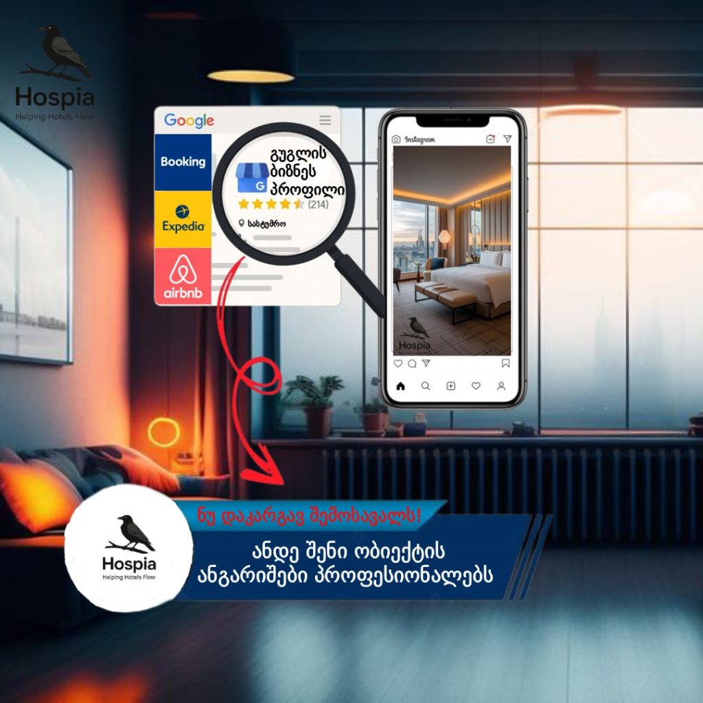 გამართული გუგლის ბიზნეს პროფილი, სადაც მითითებული იქნება ბუქინგის ან რომელიმე პლათფორმის ანგარიშის ბმული – ეს არის დამატებითი ხელშემწყობი თქვენი ობიექტის წარმატებული მუშაობისთვის.